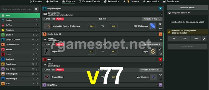 O v77 oferece uma grande seleção de opções de apostas em e-sports com probabilidades competitivas